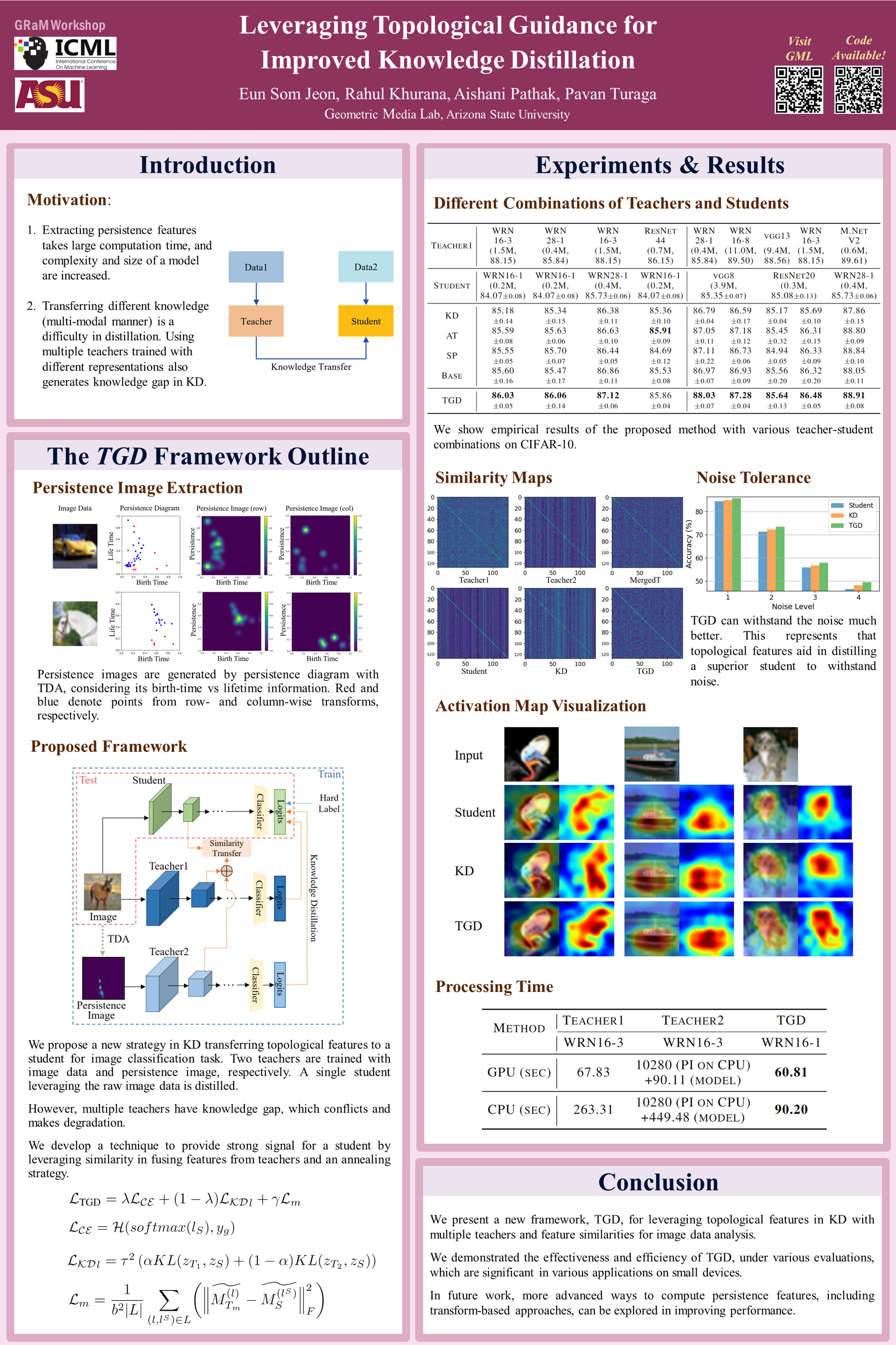 I develop topology-aware model compression methods using persistent homology to guide student networks.